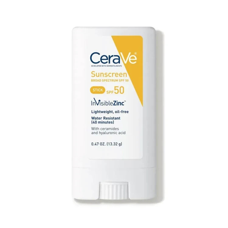 استیک ضد آفتاب CeraVe با طیف وسیع SPF 50 دارای فیلترهای UVA و UVB اکسید روی و دی اکسید تیتانیوم در فرمول مراقبت از آفتاب بدون عطر، بدون روغن و مناسب است.