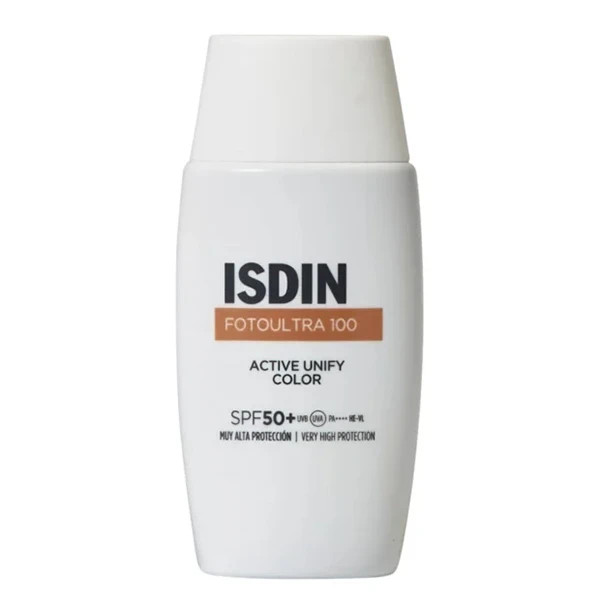 ضدآفتاب اکتیو یونیفای رنگی ایزدین SPF50 یک ضد آفتاب ضد لک و روشن کننده از برند اسپانیایی Isdin میباشد. این ضد آفتاب به صورت فیوژن فلوئید است و دارای بافتی بسیار سبک می باشد و به سرعت جذب پوست شده و احساس سنگینی ایجاد نمیکند. ضد آفتاب ضد لک اکتیو یونیفای رنگی ایزدین حاوی کمپلکس ضد لک DP3 است که حاوی ماده موثر PKEK است و با تأثیرگذاری بر مراحل اصلی ملانوژنز باعث تنظیم تولید ملانین پوست میشود و در نتیجه میزان لکهای پوست کاهش پیدا میکند. این ضد آفتاب از ایجاد لکهای ناشی از نور خورشید جلوگیری میکند. نتایج استفاده از این ضد آفتاب بعد از ۱ ماه استفاده مداوم کاملا مشهود است.